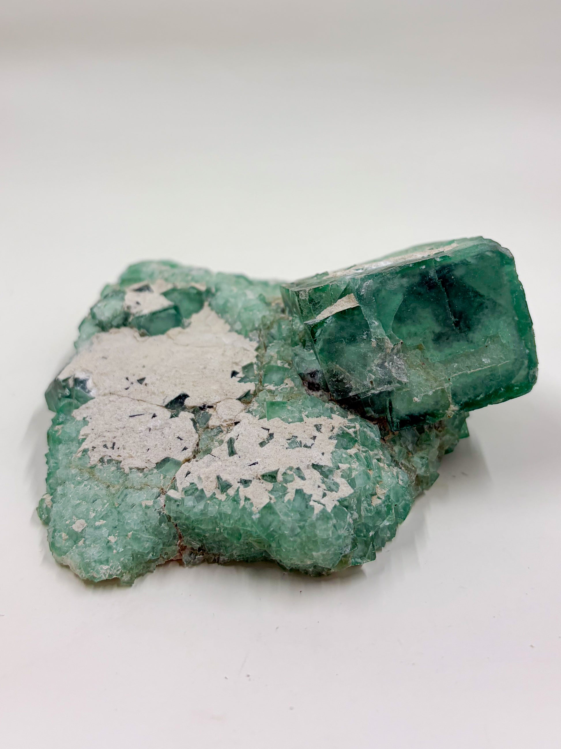 A spectacular fluorite specimen from Namibia, Africa Boast a magnificent natural cubic crystal formation reaching over 1x1 inch in size, this specimen is UV reactive under Longwave ultraviolet light. This self standing specimen, displays a beautiful seafoam green/ teal blue color with minor matrix dispersed over the specimen.